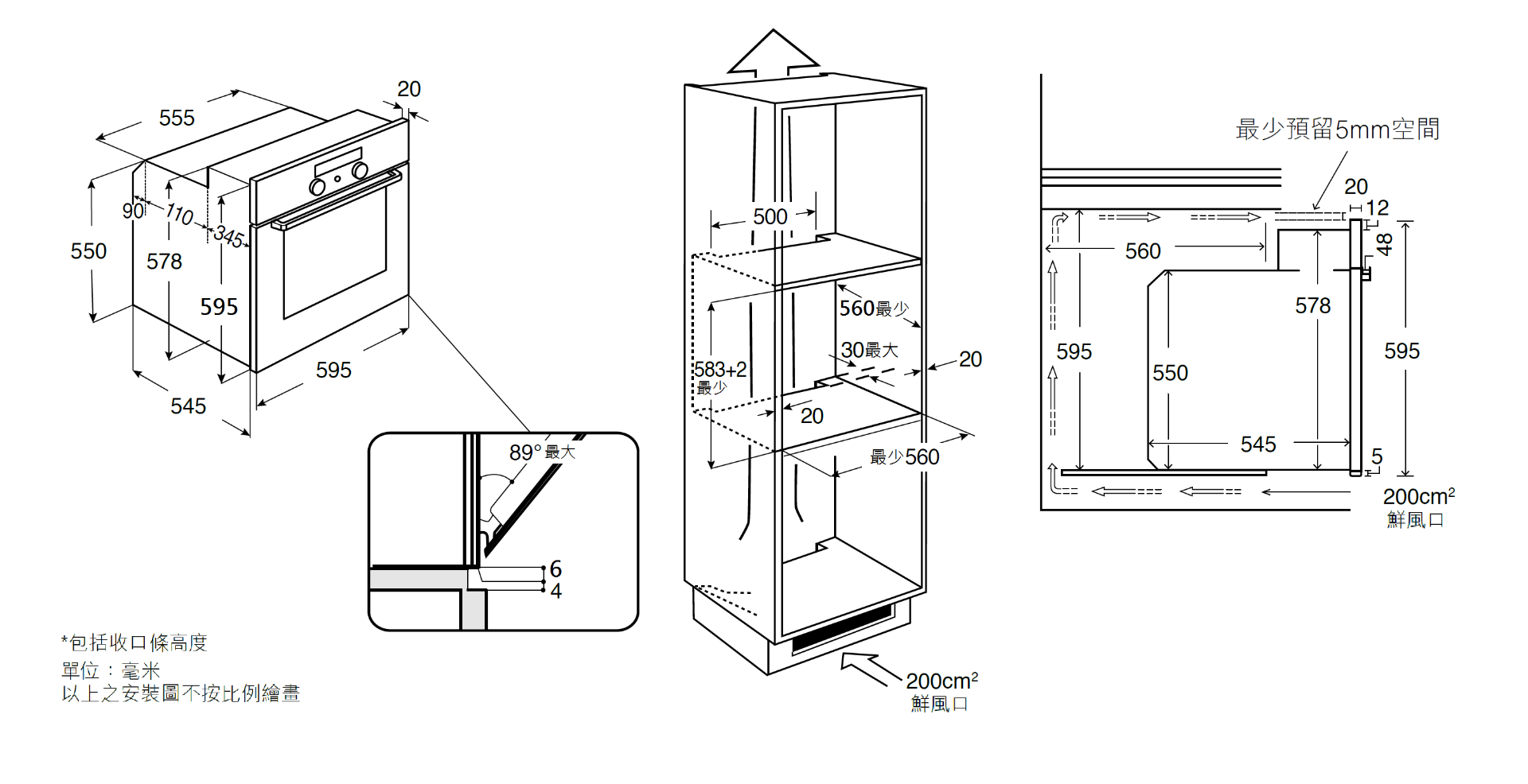 開孔尺寸 (高x闊x深/毫米):583-585/600 x 560 x 560
