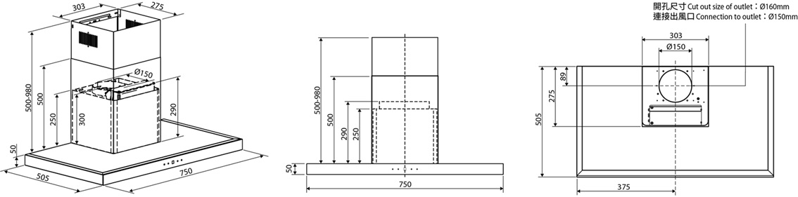 76cm Box Chimney Cookerhood, 1000m3/hr